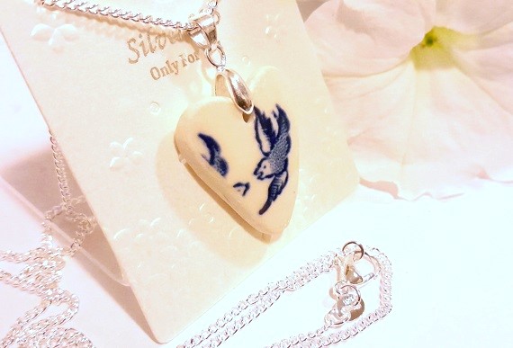 Heart Pottery Necklace with Blue Willow Love Bird with 925 Silver