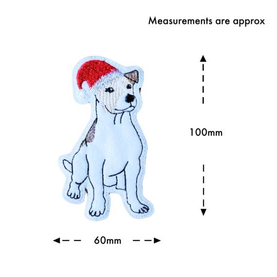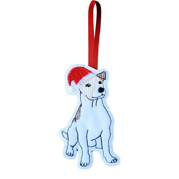 The machine embroidery, stitched with high-quality threads, showcases a sitting Jack Russell Terrier, whose perky ears and attentive expression capture the breed’s iconic charm. Dressed in a vibrant red Santa hat is truly a piece of festive spirit.