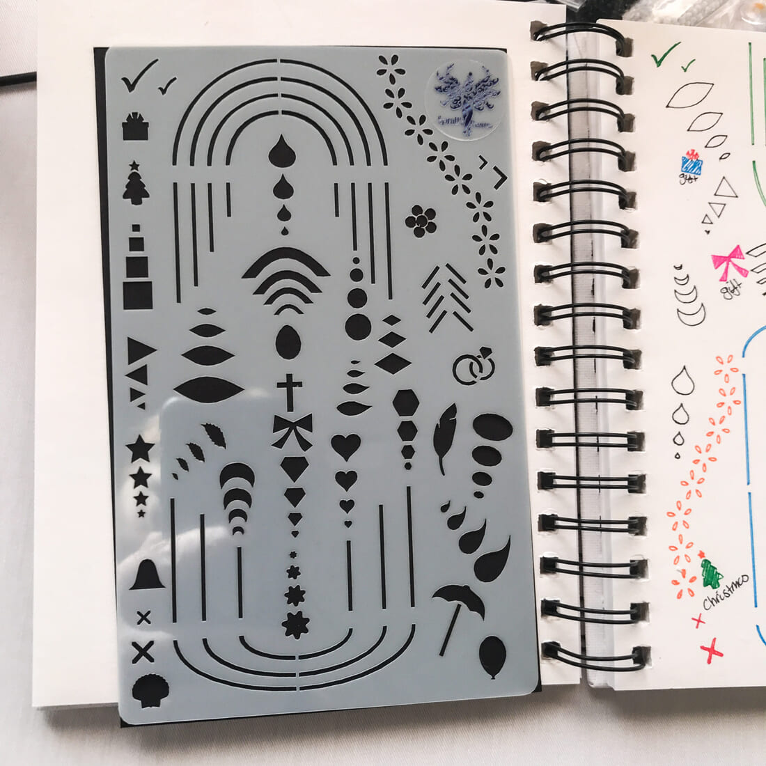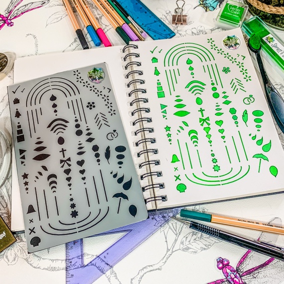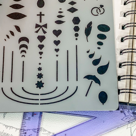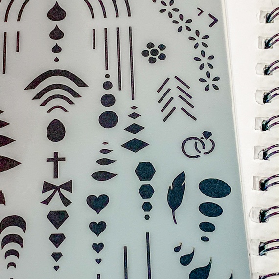 In addition to traditional shapes, this stencil provides options for feathers, bows, and feathered lines to add intricate details to your designs. Made slightly smaller than an A5 journal, the stencil and bookmark sizes are ideal for slipping into stationery, organizers, notebooks, or Filofaxes.