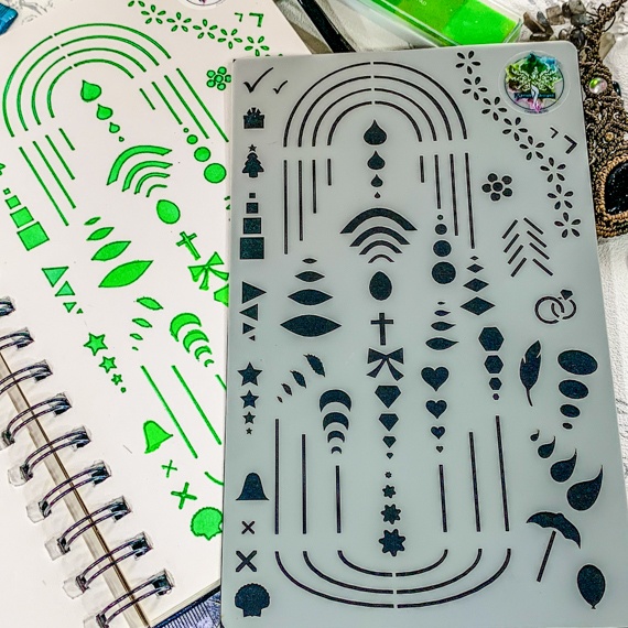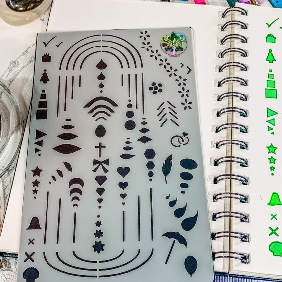 The stencil is crafted from 190-micron Mylar, offering a balance of strength and flexibility for ease of use. Its compact design makes it a versatile tool that can also double as a bookmark in your journals, adding functionality to your creative process.