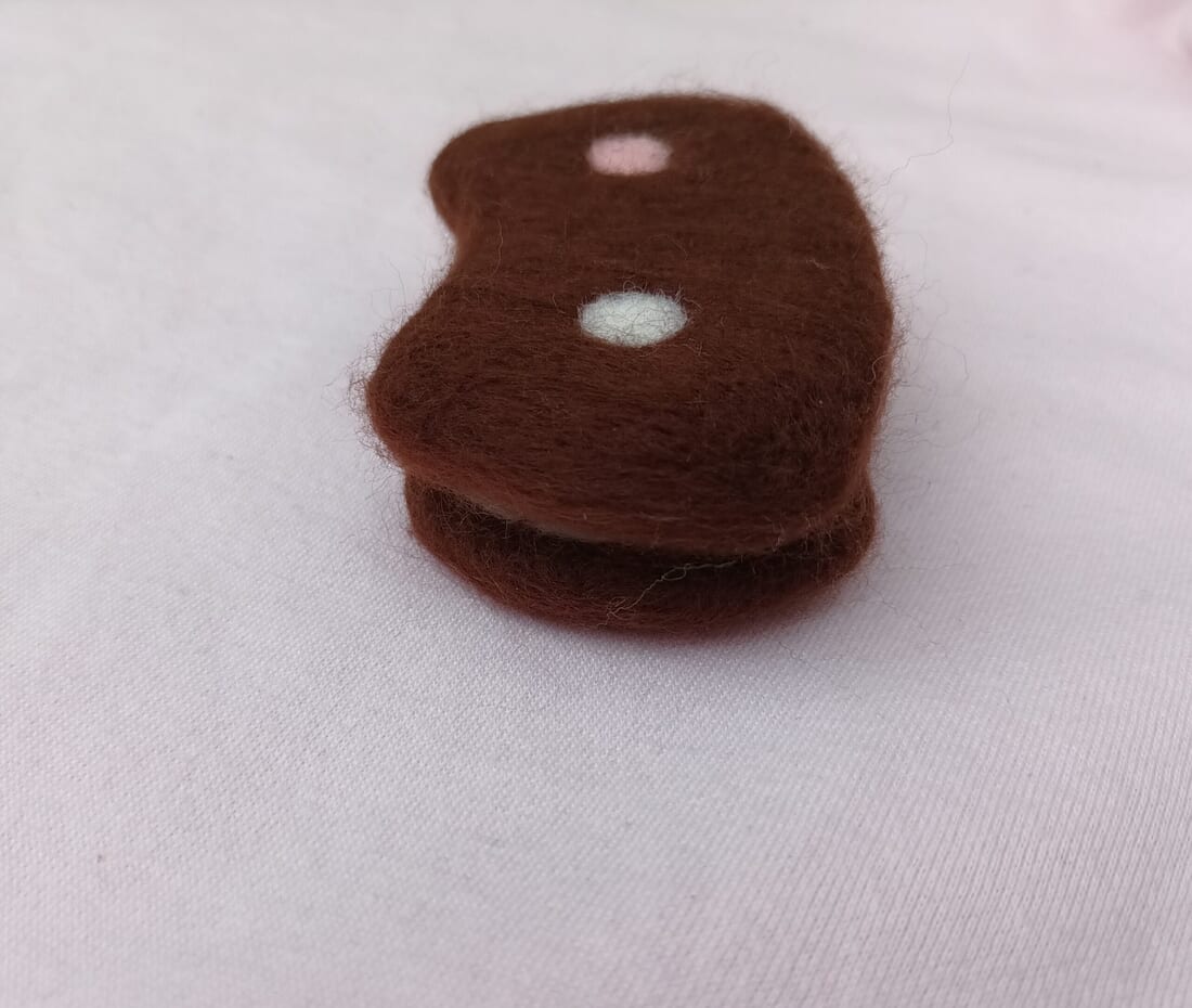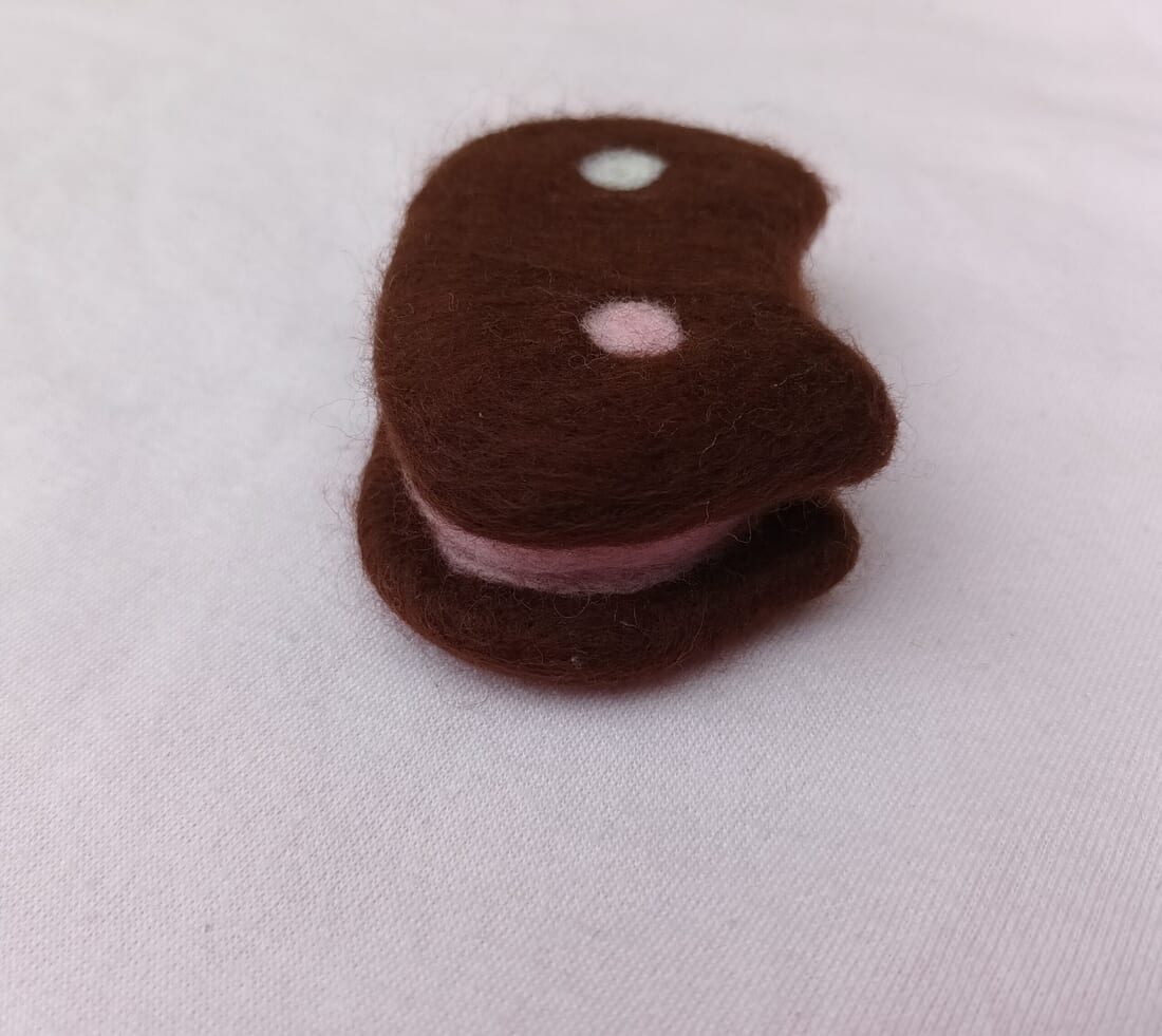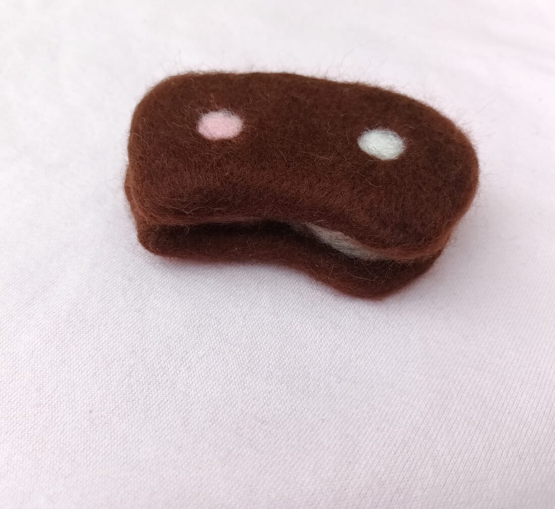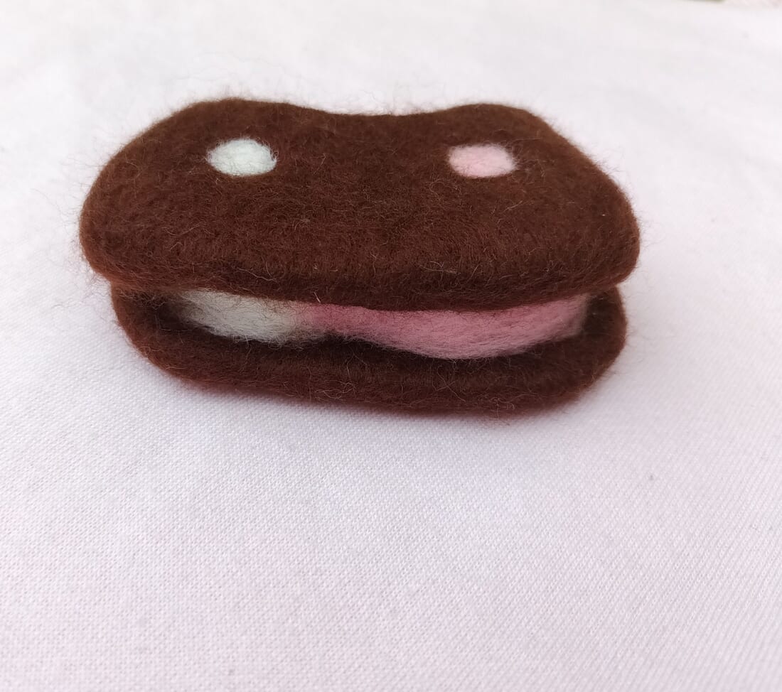 This ice cream sandwich shaped like a cat has vanilla and strawberry colours and a “chocolate biscuit” outside. A nice looking addition for a fan collection but please do not eat!