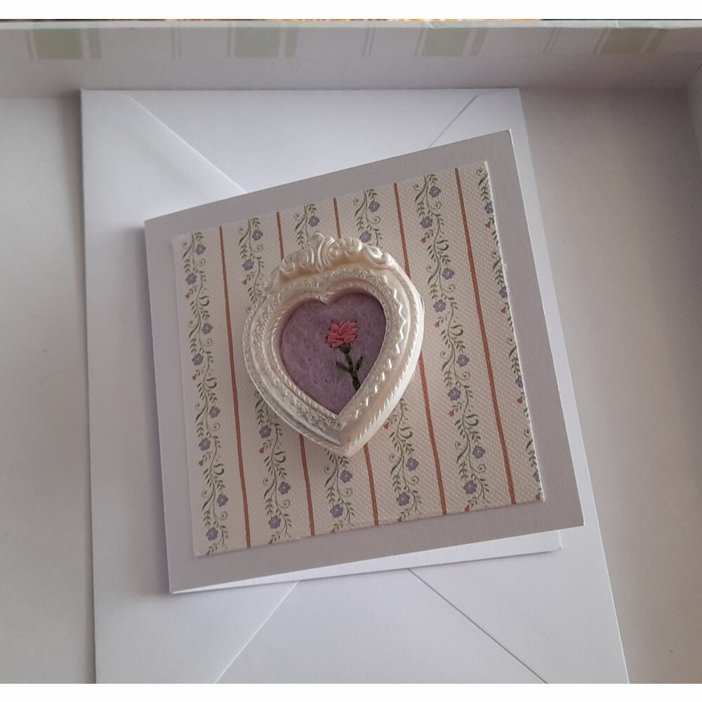 I embroidered this lilac aster flower, framed in in this mini frame, attached a magnet to the back of it, and placed it with double sided sticky tape onto this pretty greetings card I made.
