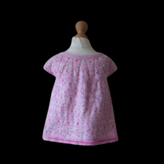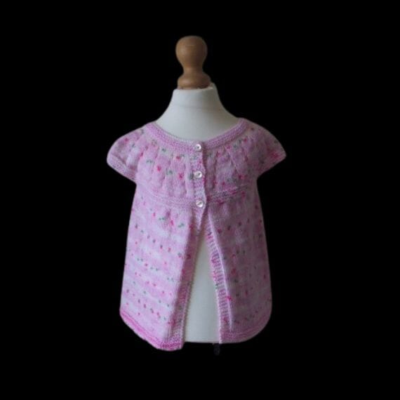 The design of this baby girl cardigan has little cap sleeves, a lacy pattern yoke on the front and back of the garment and three button front fastening.