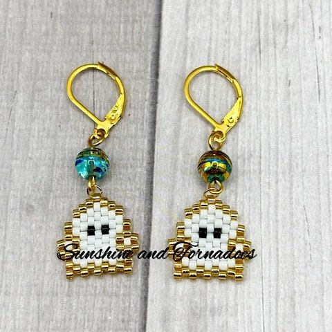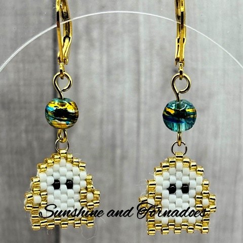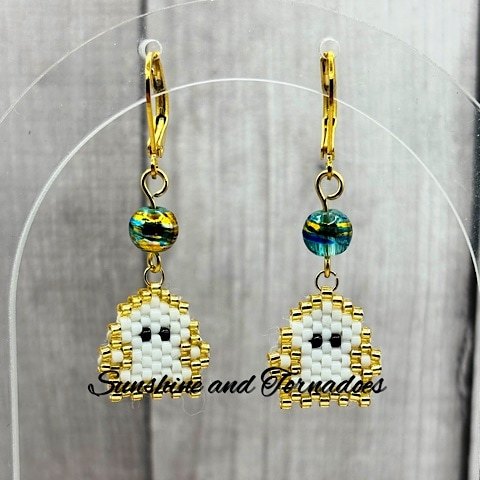 These cute bead work ghost earrings are outlined by 18ct Gold Plated beads, and are presented on your choice of hypoallergenic ear wires.