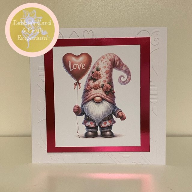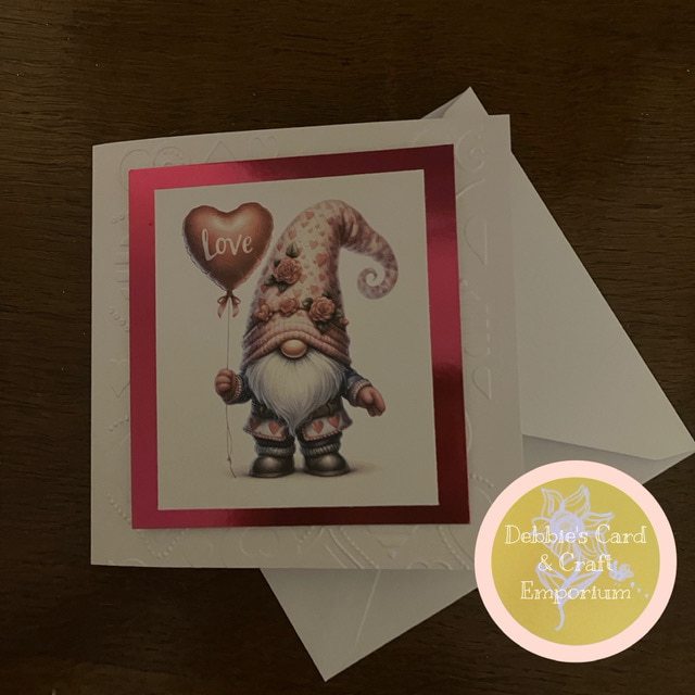 This cute and quirky card is Matt & Layered onto quality cardstock, embossed with a modern heart background and topped with this gorgeous Gonk design, perfect to send to a loved one.