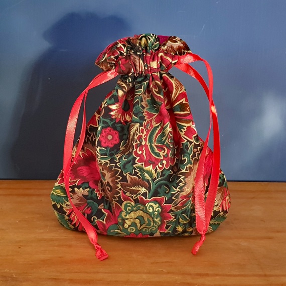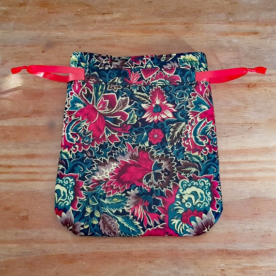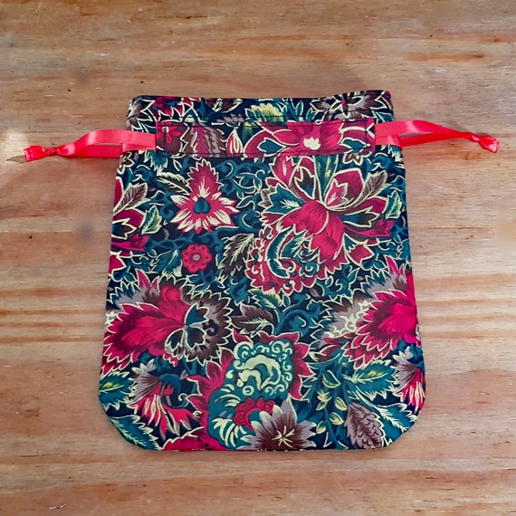 This one-of-a-kind mini Christmas gift bag features a luxurious metallic floral print in rich jewel tones, reminiscent of poinsettias and festive blooms. Lined in deep berry red and finished with a satin ribbon drawstring, it’s as joyful as the gifts it holds!