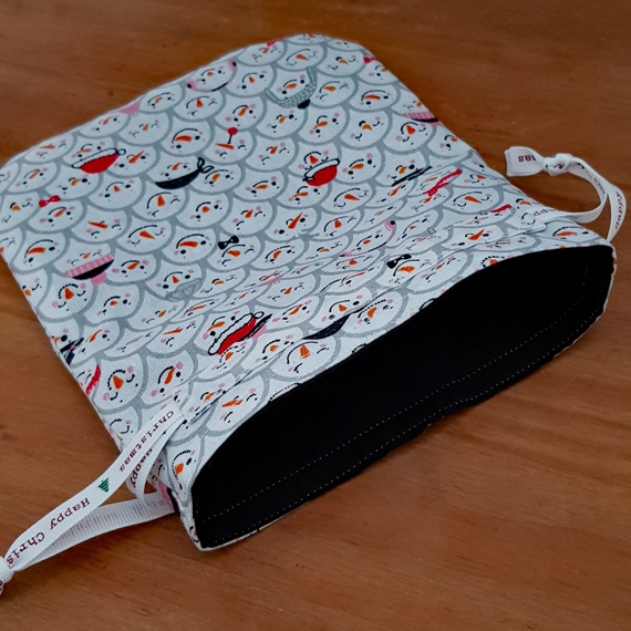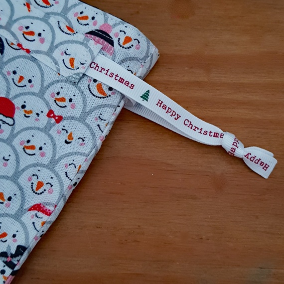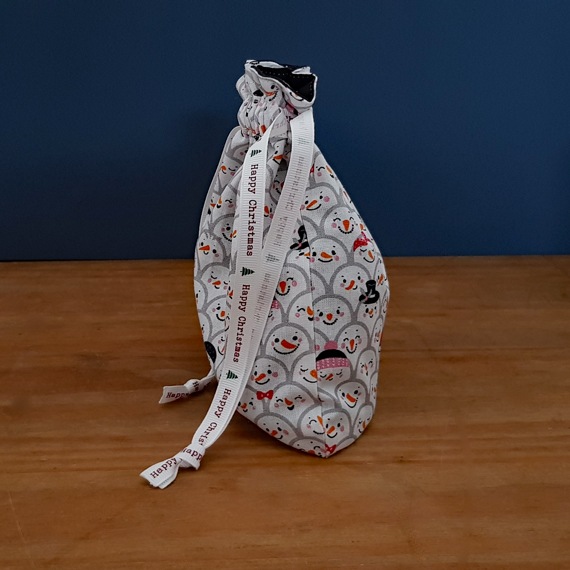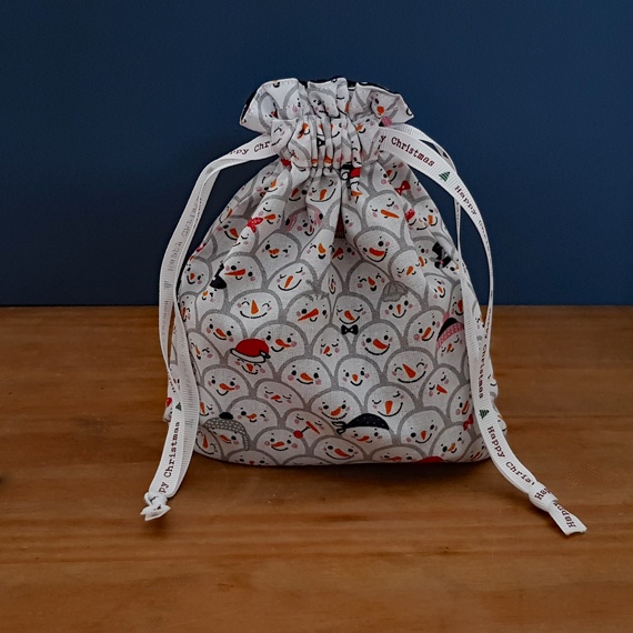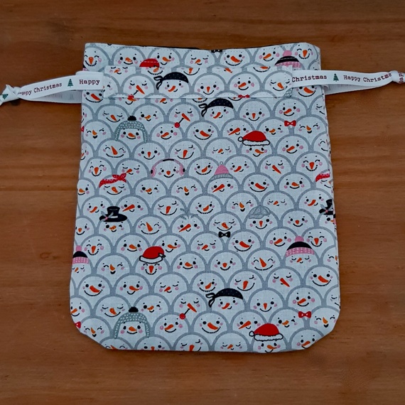 Mini Eco-Friendly Reusable Christmas Gift Bag – Snowman Faces Print – Fully Lined Fabric Drawstring Bag