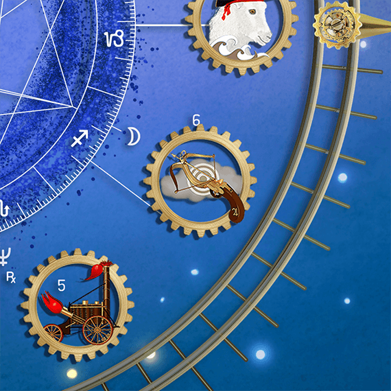 - Intricate steampunk zodiac characters framed by brass cogs