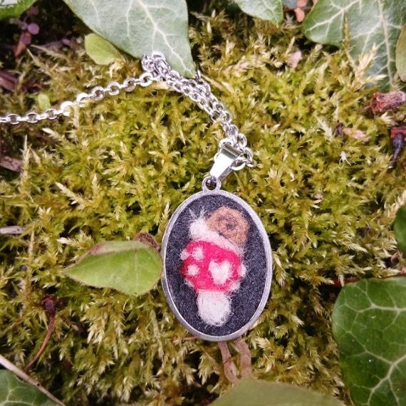 Bring a piece of the forest with you wherever you go with this exquisite Needle Felt Miniature Mushroom and Snail Pendant in stainless steel.