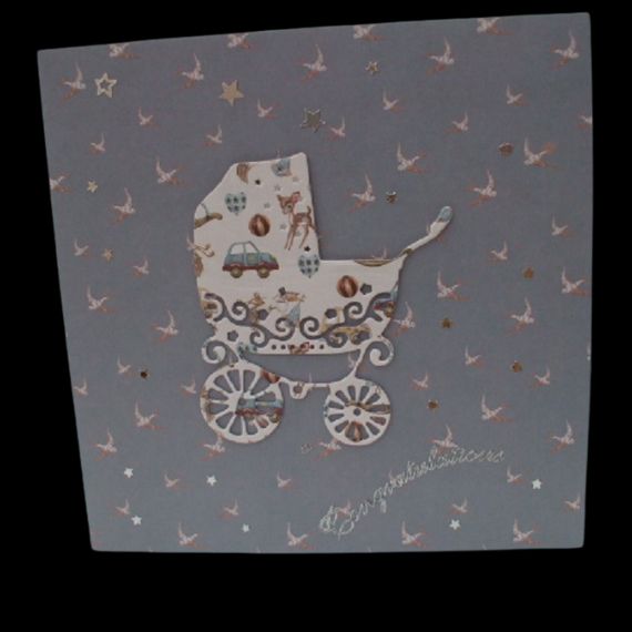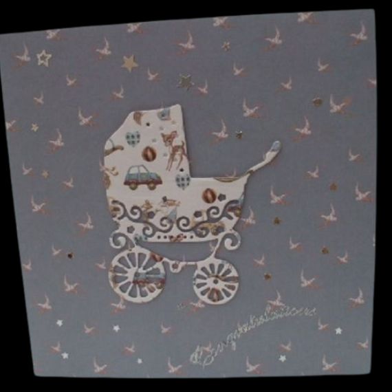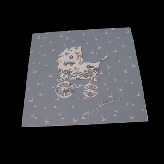 The intricate die-cut image of the vintage pram adds a touch of elegance and sweetness to the card, making it a keepsake to treasure.