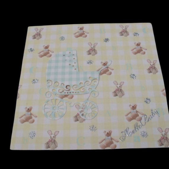 - Die-cut design of a vintage pram, adding a nostalgic touch to the card