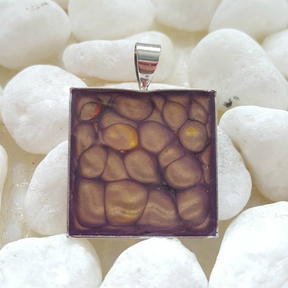 One-of-a-Kind Hand Painted Purple & Gold Resin Pendant – Abstract Organic Square Necklace – Artisan Jewellery UK