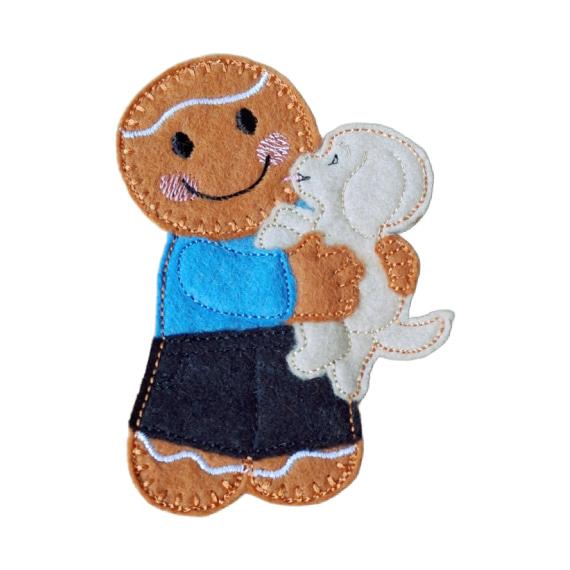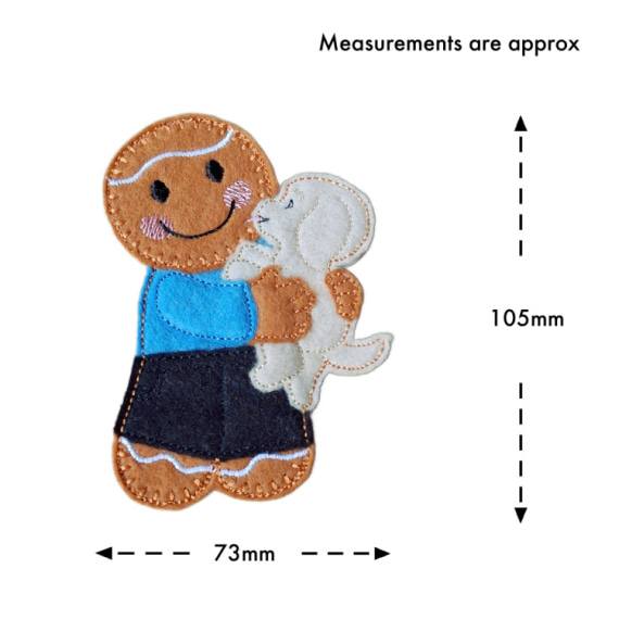 You can choose between a male or female gingerbread character (the female features delicate embroidered eyelash details). You can also personalise the colours of both the gingerbread’s clothing and the puppy.