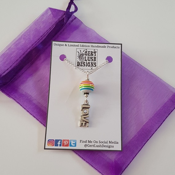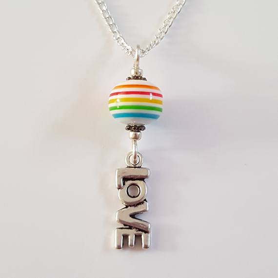 The necklace features a vibrant rainbow-striped bead, paired with a silver-tone LOVE charm that makes a bold yet meaningful statement. It’s a perfect accessory for Pride celebrations, a thoughtful gift for someone special, or simply a way to carry a little colour and joy with you every day.