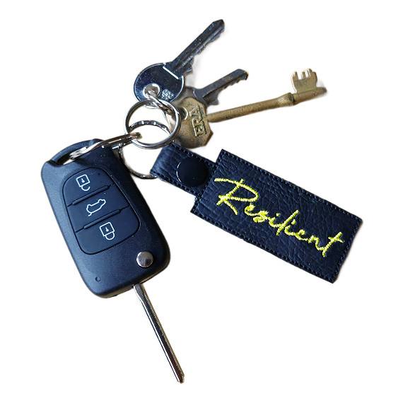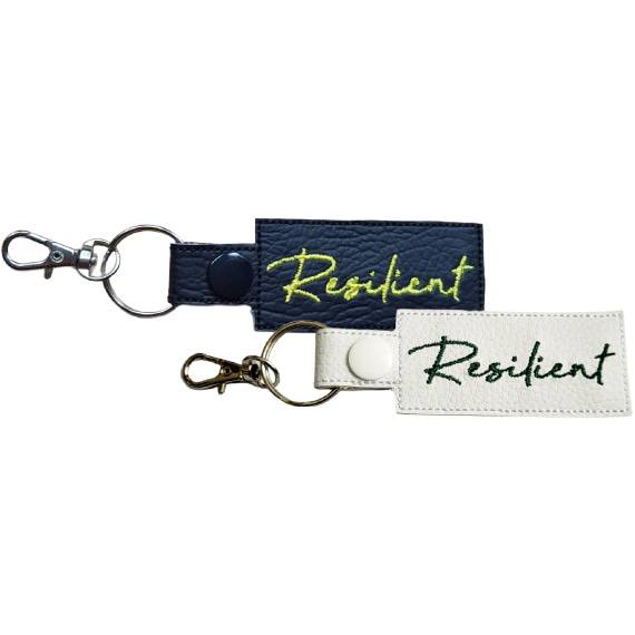 Each keyring is made from high-quality faux leather, offering a refined and durable finish. The word Resilient is machine embroidered with premium threads for a clean, detailed design that is both striking and long-lasting.