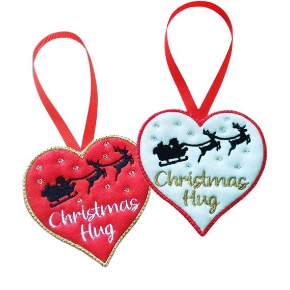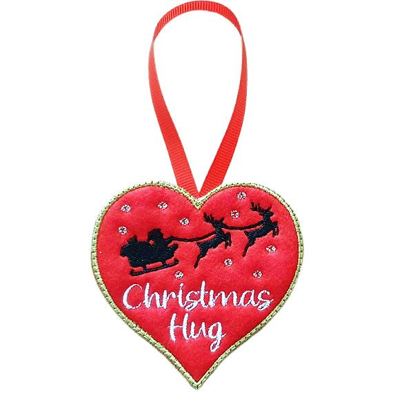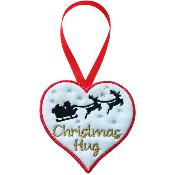 Spread love and festive cheer with this beautiful Santa Sleigh Christmas Hug Heart Tree Decoration. Crafted from soft, high-quality fabric and machine embroidered with premium threads, this keepsake features Santa in his sleigh pulled by reindeer, surrounded by delicate snowflake accents. Available in classic red or frosty white, it’s designed to match any festive décor. Hang it on your Christmas tree, wall, door knob, or window latch to add a warm and cosy sentiment to your home.