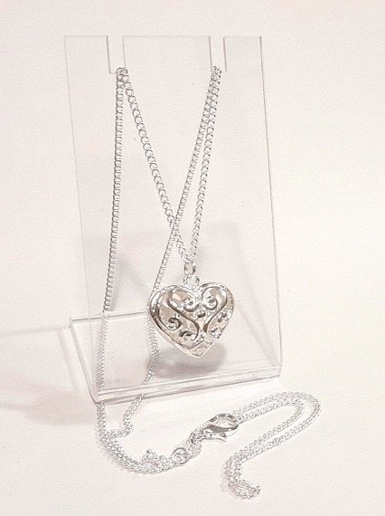 Upgrade your style with an exquisite Silver Plated Filigree Heart Necklace, showcasing intricate detailing on a 925 silver chain. Polish cloths provided free.