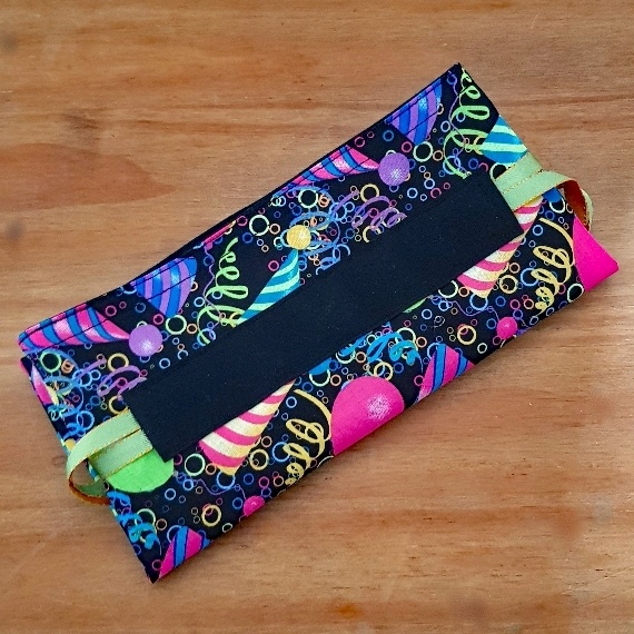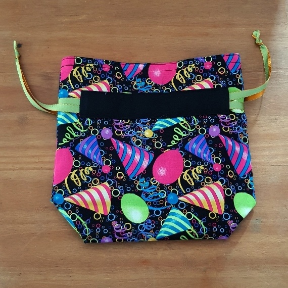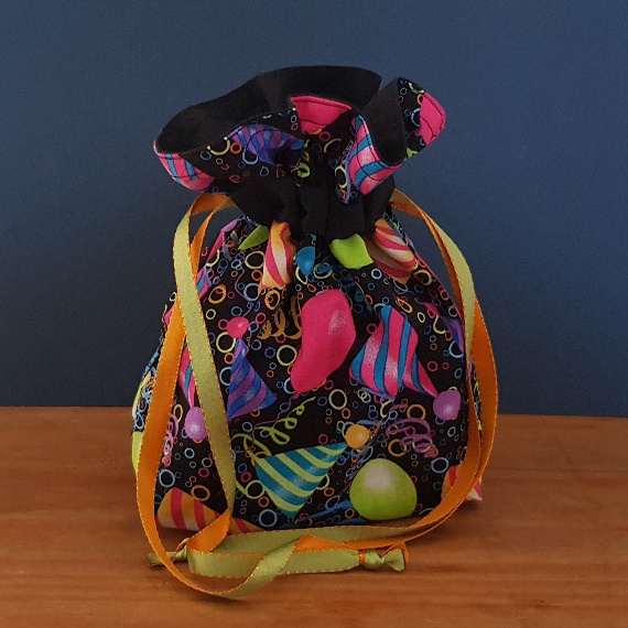 Celebrate sustainably with this festive reusable birthday gift bag! Featuring bright balloons and party hats on black cotton fabric, these eco-friendly drawstring bags are perfect for gifts, favours, or fun storage.