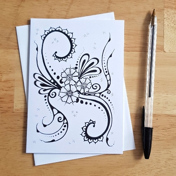 Send art with heart. This stunning black and white card features an intricate floral doodle design called “Sprouting Glory” – perfect for any message, any time.