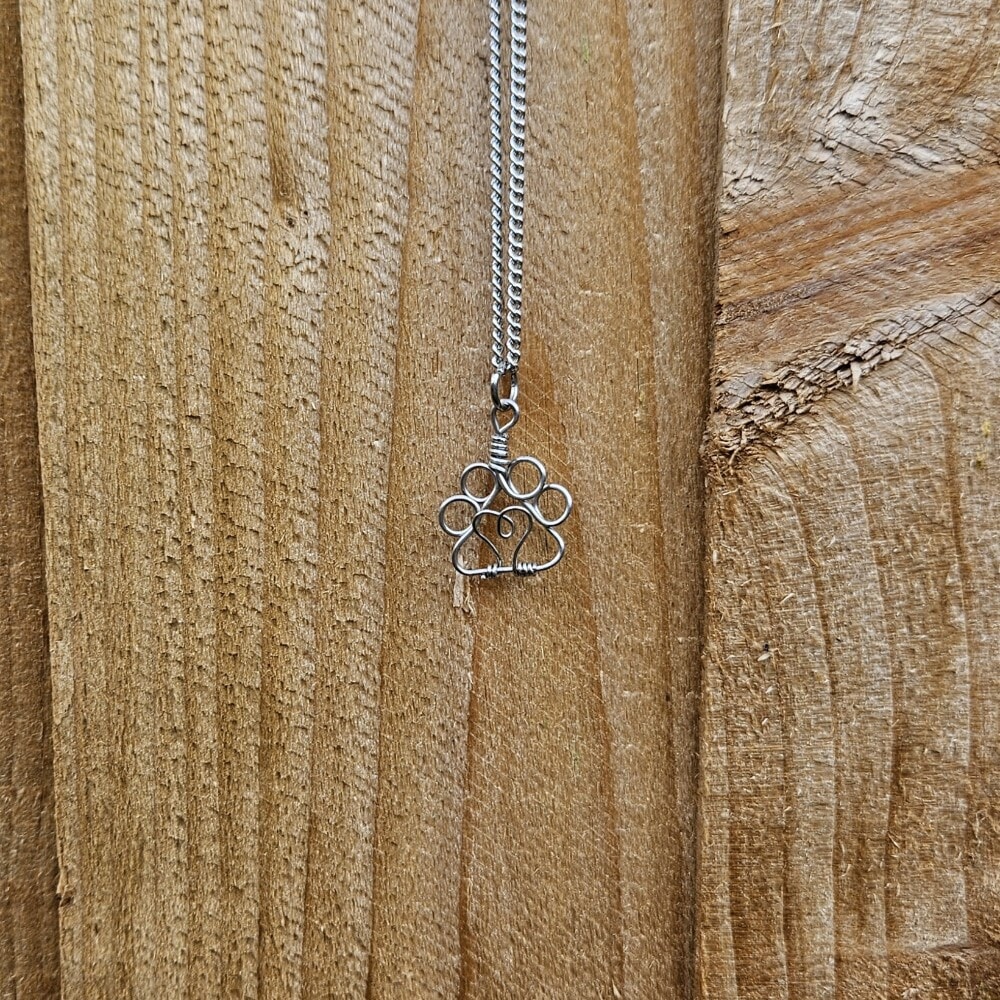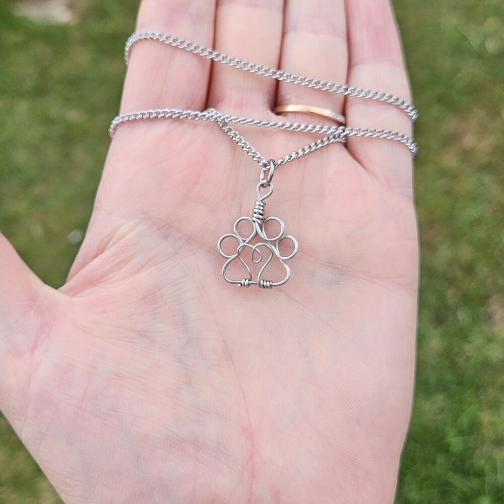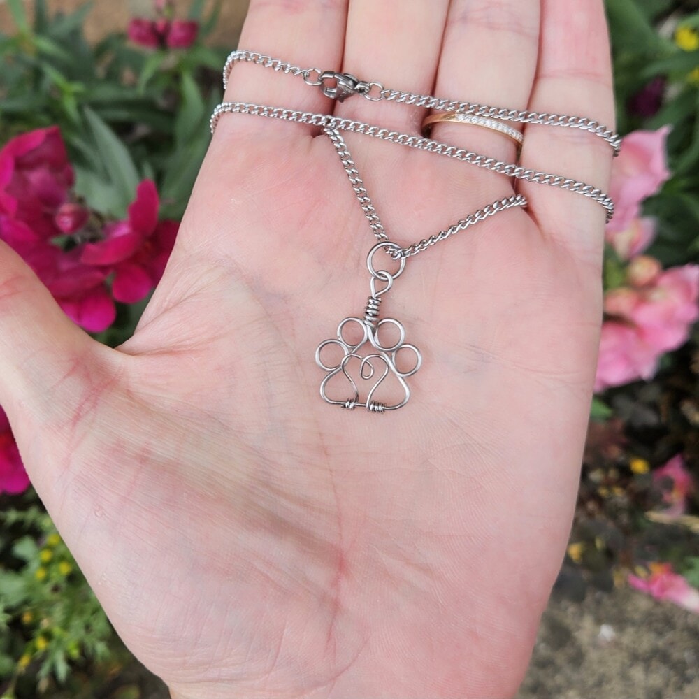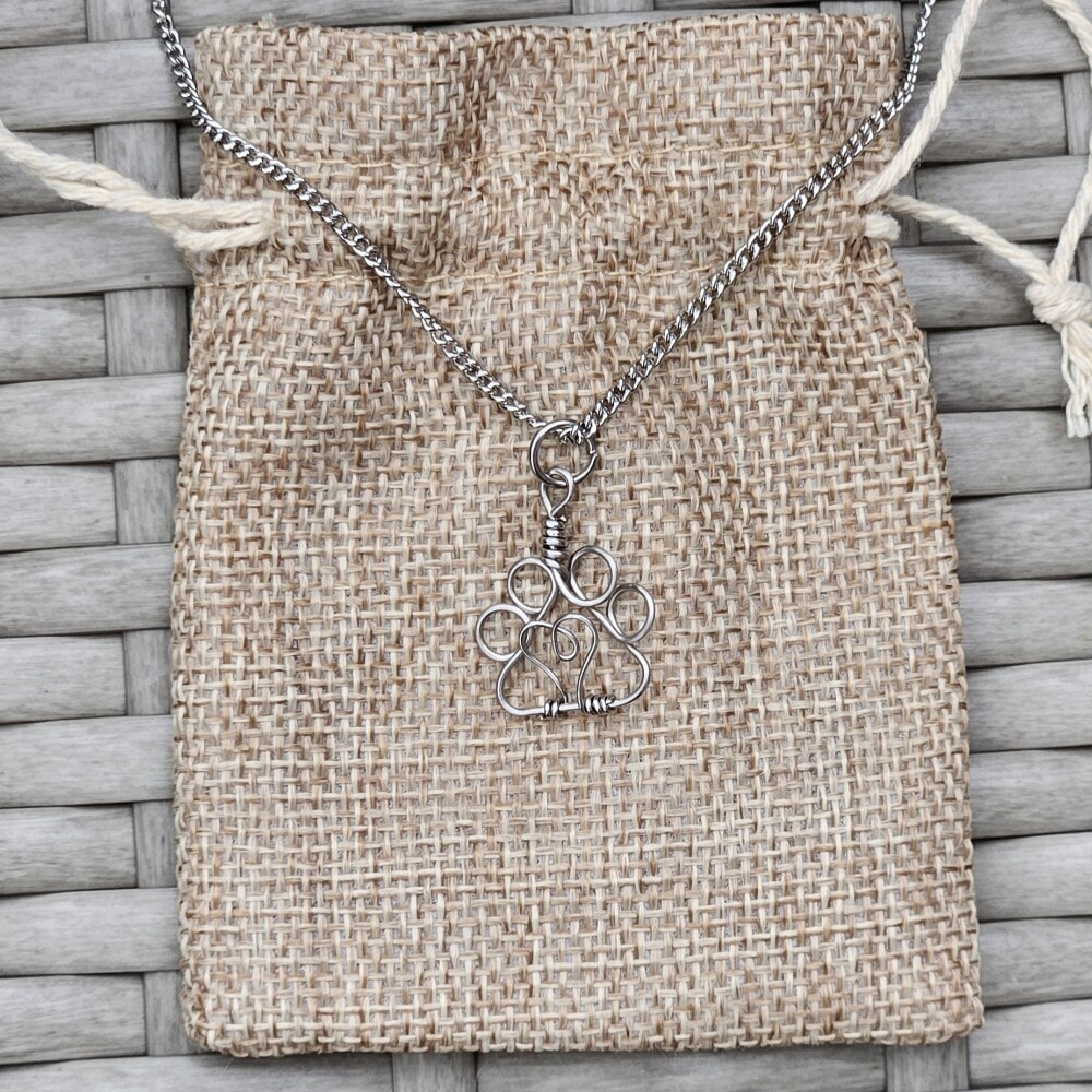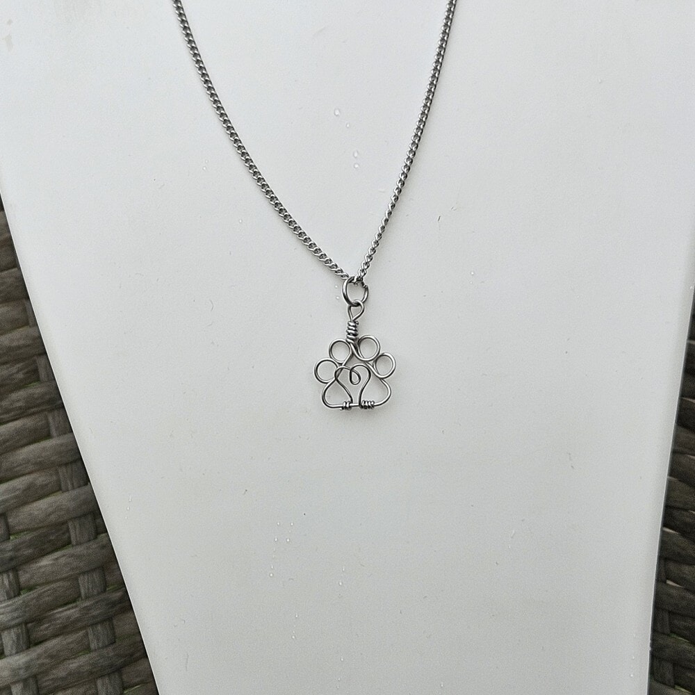 Discover our stainless steel paw pendant necklace with a charming heart design. Handcrafted from 0.8mm grade 314 stainless steel wire, this cat or dog paw pendant is a symbol of love and companionship.