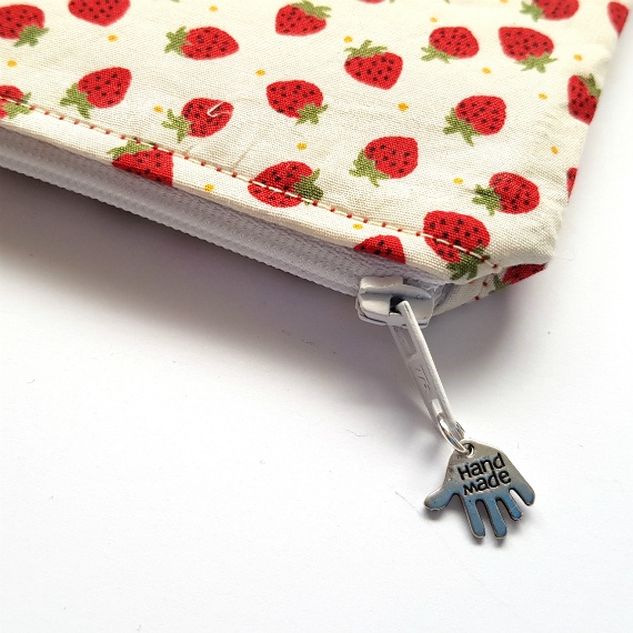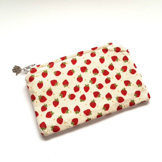 Sweeten up your everyday essentials with this handmade strawberry print zipper pouch – perfect for coins, cards, meds and more!