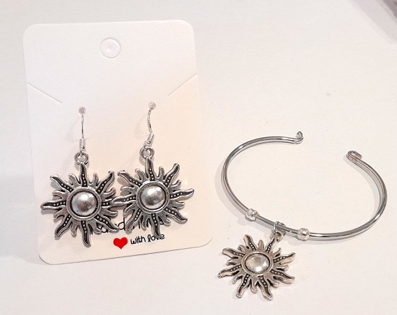 Sun Charm Earrings and Rhodium Plated Pagan Bangle Jewellery Set with 925 silver wires