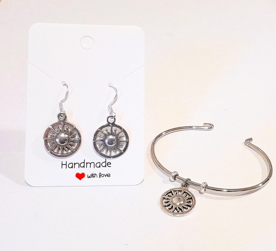 Discover the enchanting Sun Charm Earrings and Solid Rhodium Plated Pagan Bangle Jewellery Set. This stunning set exudes mystical elegance and bold style, perfect for expressing your unique personality. Rhodium plated jewellery has lasting protection and lustre.