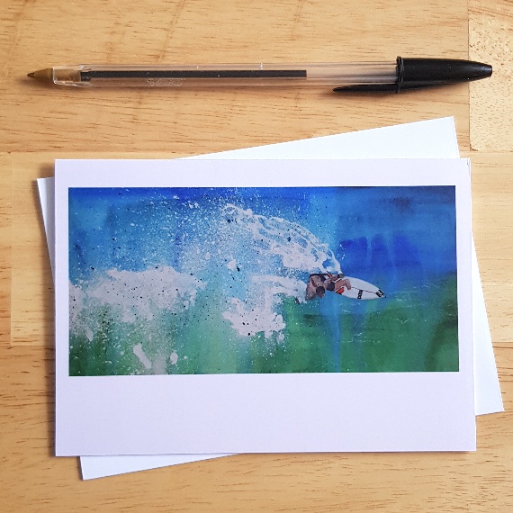 An energetic greetings card featuring a dynamic acrylic painting of a surfer carving through ocean waves — ideal for birthdays, thank you notes, or beach lovers.