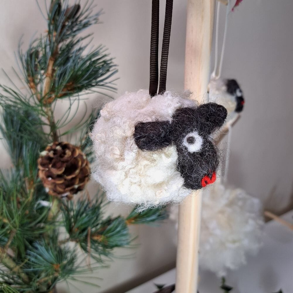 Natural Handmade sheep bauble made with pure British Wool bought directly from local farmers in Staffordshire. No two are alike. Wet felted with needle felted finishing touches.
