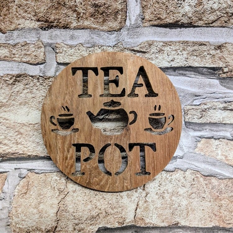 Enhance your tea-drinking experience with our exquisite wooden coasters set. This set includes two coasters: one with a teapot cutout and the other with a cup and saucer design featuring the letter ‘T’. The intricate detailing adds a touch of elegance to your table setting.