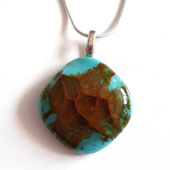 Turquoise & Ochre Fused Glass Pendant Necklace – Handmade & Unique