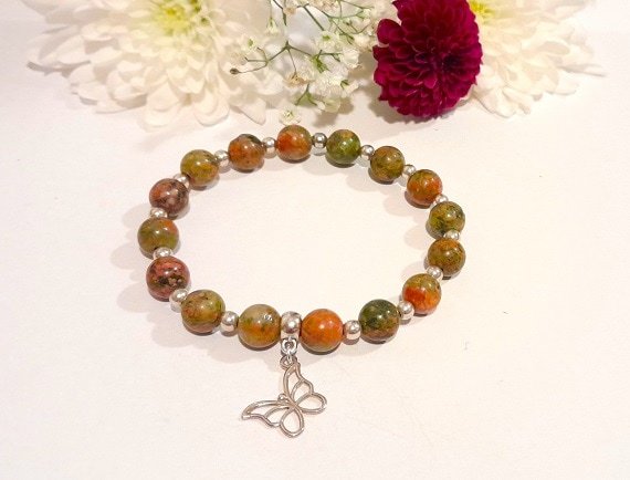 Enjoy a touch of nature with this Unakite Beaded Bracelet featuring a delicate Sterling Silver Butterfly Charm. This stunning bracelet is a perfect blend of earthy elegance and whimsical charm, making it a must-have accessory for any nature lover with its petitte 8mm beads.