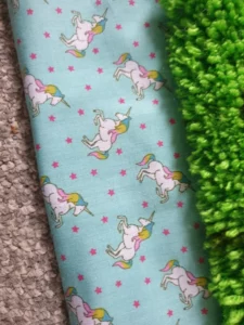 This is a unicorn latch hook canvas (12″x12″) stitched onto unicorn fabric and made into a fully lined bag measuring approx 15″x18½”