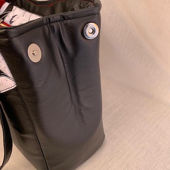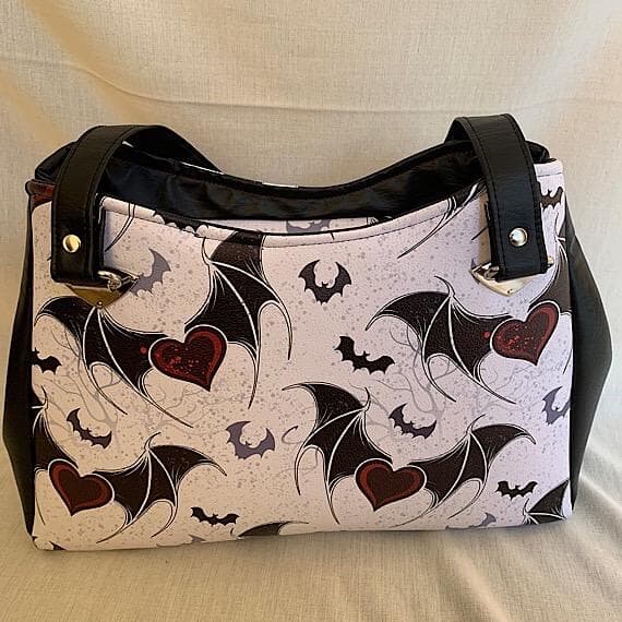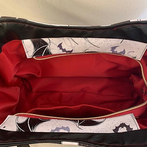 Own the only one of its kind handmade bat handbag, crafted with care and attention to detail. This weatherproof vinyl bag features a zip closure and a snap to enlarge its size when needed. Stand out with extras like bag feet, strap ends, handle connectors, handmade tag, skull zip pull, and zipper end. The interior is lined with waterproof red fabric and includes a convenient zip pocket. This statement piece measures 10.5 inches tall and 15 inches wide.
