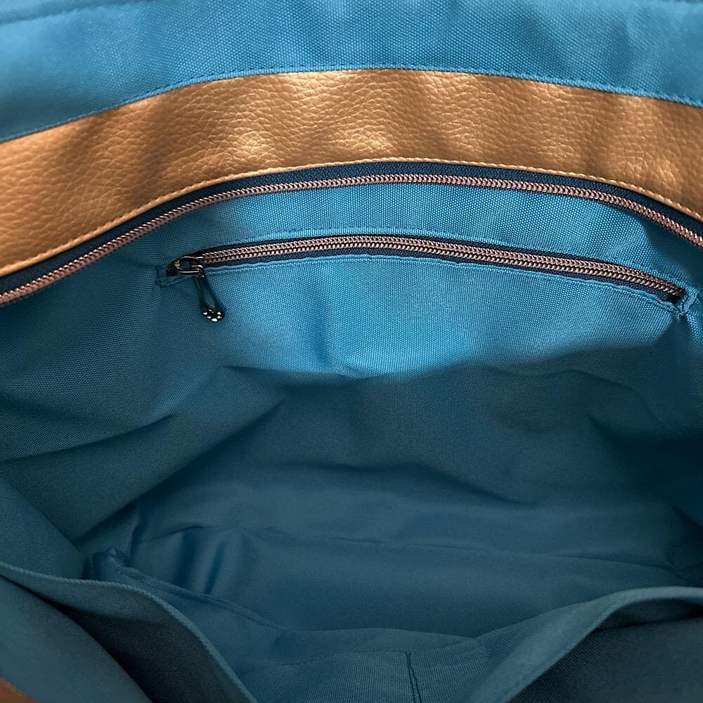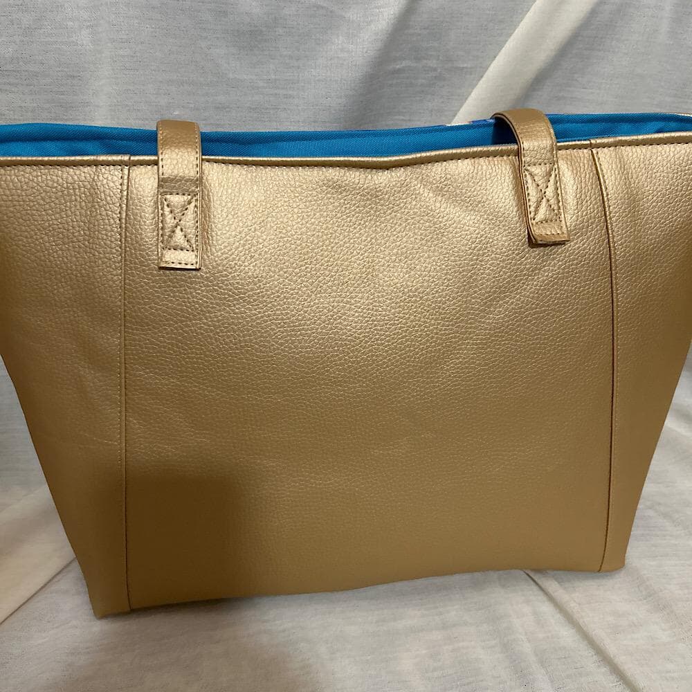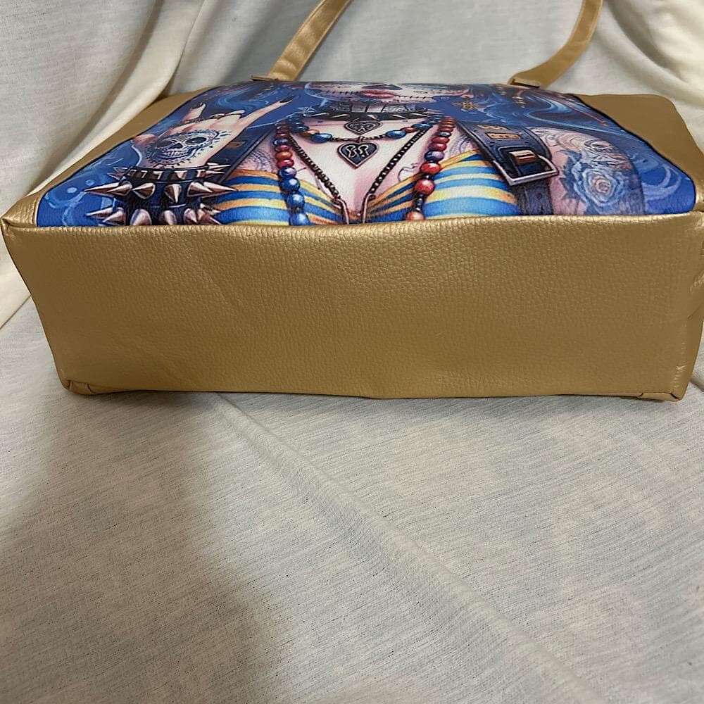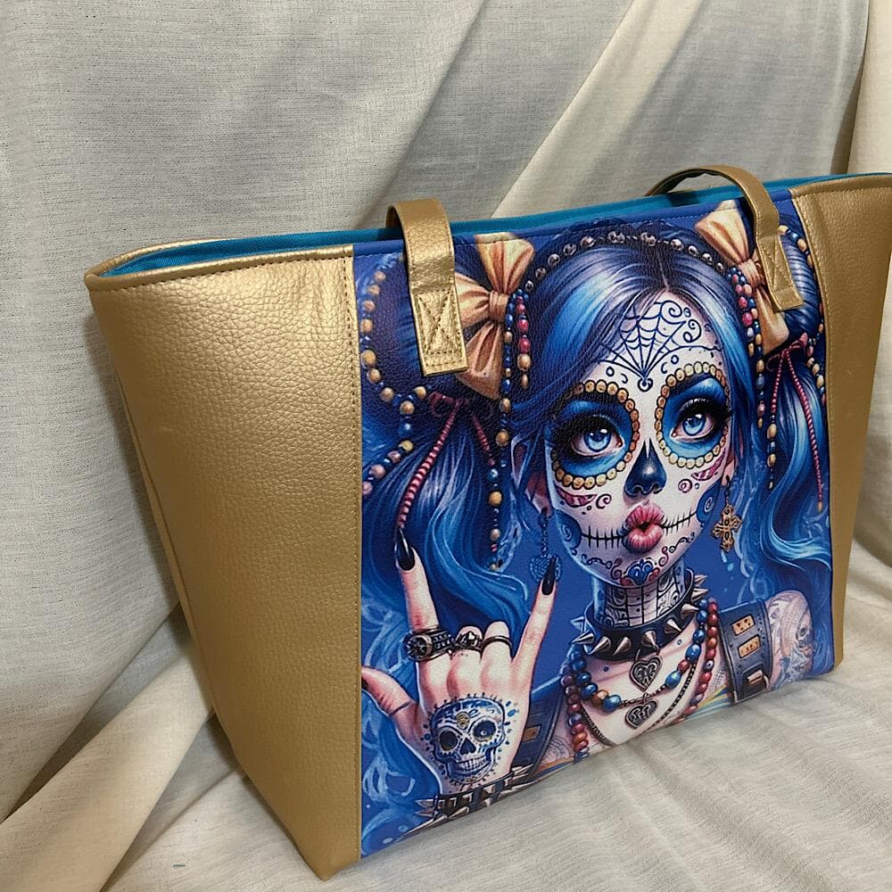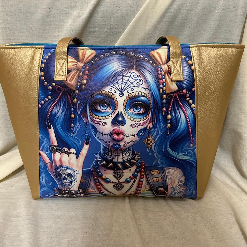 Elevate your style with this exclusive handmade vinyl tote handbag featuring a striking blue and gold punk style girl print on the front. Stand out with the bold design of blue hair, tattoos, and more. The bag is accented with gold sides and bottom, adding a touch of luxury. It comes with a zipper top adorned with a funky face zip pull, 2 handles for easy carrying, and a matching blue interior with 2 slip pockets and 1 zip compartment. Perfectly sized at 12 inches tall and 15.5 inches wide.
