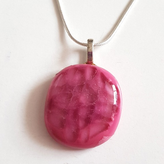 A bold and beautiful handmade fused glass pendant in rich raspberry pink tones with natural swirls and shimmer. A one-off piece full of personality and charm.