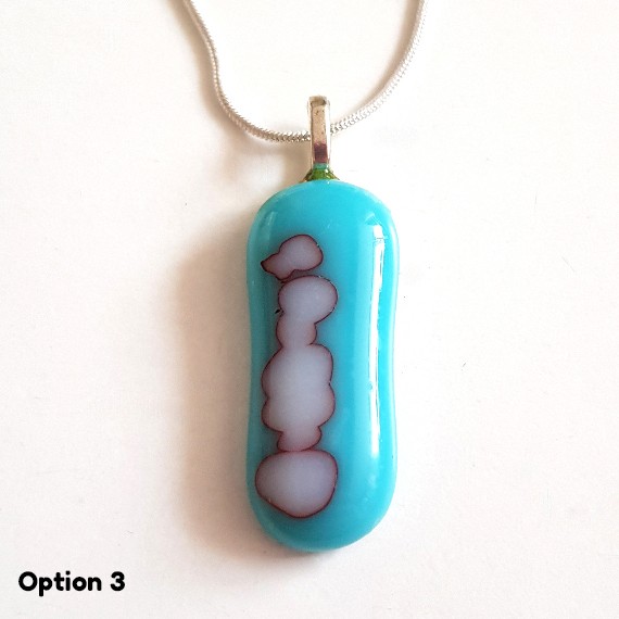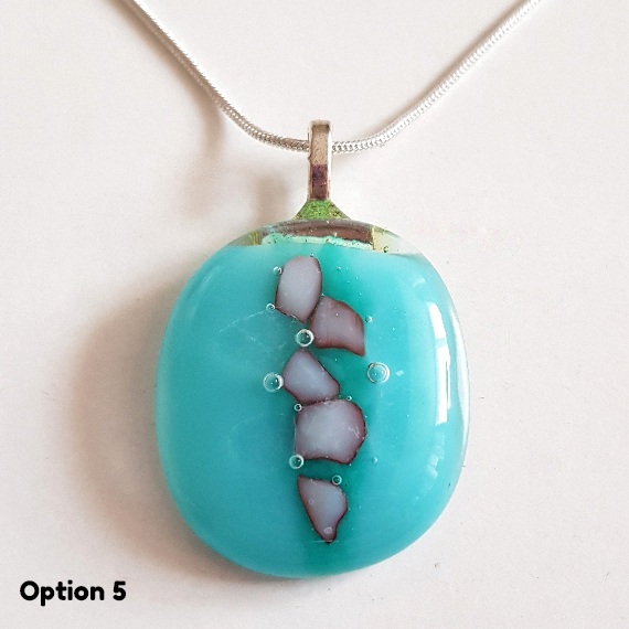 Add a pop of vibrant colour and organic artistry to your outfit with one of these unique handmade fused glass pendants. Each piece is crafted in a bold turquoise glass with whimsical, abstract inclusions that appear like soft bubbles or cell-like forms. These fascinating shapes are formed through natural reactions during kiln firing, creating an almost biological or geological aesthetic.
