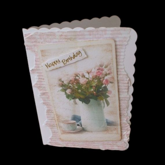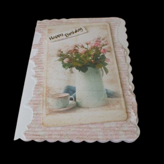 Celebrate a special birthday with this exquisite Pink Roses Birthday Card featuring a vase of flowers and a cup and saucer. The pastel colors and hand-torn edge of the paper create a charming and elegant look.