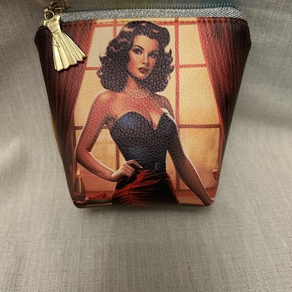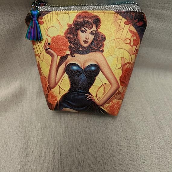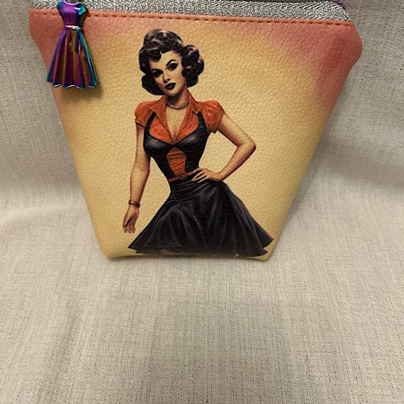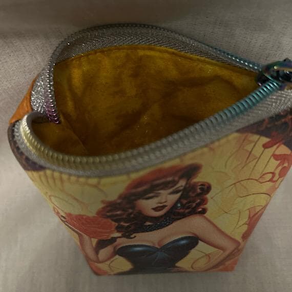 Get a touch of retro charm with this set of 4 handmade vinyl pouches in a vintage 60s style. Each pouch features a zipper top with dress zip pulls for added flair. The interior is lined with yellow sparkly cotton, adding a pop of color and fun to your storage needs. These 5-inch tall pouches are perfect for organizing your essentials with a nostalgic twist.