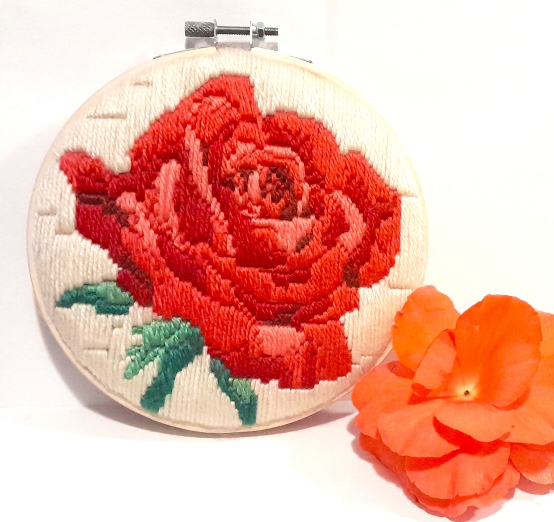 Enhance your home decor with my exquisite Rose Rouge hooped wool embroidery art in a 6-inch hoop. This unique hand sewn rose piece features a beautiful rose design meticulously crafted with high-quality wool threads creating a domed appearance. Perfect for adding a touch of elegance and charm to any room. The reverse has felt and a sturdy backing to last for years, finished with subtle blanket stitch.